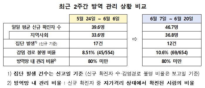 지난 21일 중앙내잔안전대책본부에 따르면 6월 7일부터 6월 20일까지 2주간을 1일 평균 신규 확진환자 수는 46.7명으로 이전 2주간(5. 24.∼6. 6.)의 39.6명에 비해 증가했다.