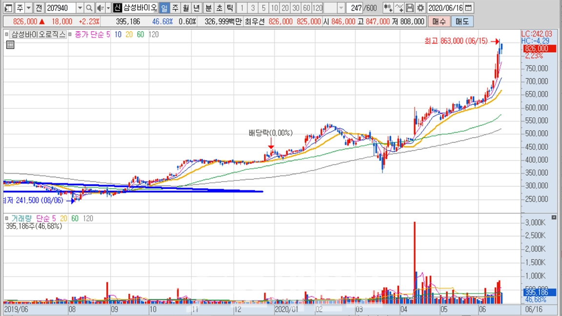삼성바이오의 주가는 연초인 1월 2일의 42만8500원보다 92.8% 올랐고 52주 저점인 지난해 8월 6일의 24만1500원에 비해서는 3.4배 급등한 수준입니다.