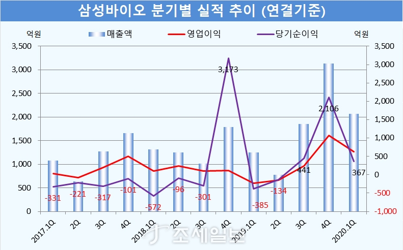 삼성바이오는 올해 1분기 연결기준 매출액이 2072억원으로 전년동기에 비해 62.6% 증가했습니다. 영업이익과 당기순이익은 626억원, 367억원으로 각각 전년동기 적자에서 흑자로 전환했습니다.
