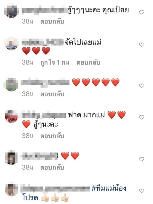 ชาวเน็ตเข้ามาคอมเมนต์ให้กำลังใจกันล้นหลาม ว่า เป็นกำลังใจค่ะแม่ , เอาใจช่วยนะคะ💕, คุณเป้ย ผอมลงรึป่าวค่ะ.... ดูแลสุขภาพด้วยนะคะ, คุณเป้ย ผอมลงจนจำไม่ได้เลยค่ะ, สู้ๆๆนะค่า 😁😍❤️❤️❤️,