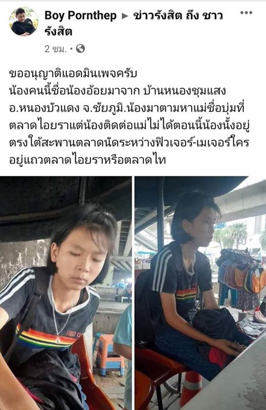 เด็กหญิงตามหาแม่หลังติดต่อไม่ได้แต่ก็ยังไม่เจอ - เด็กสาวเดินทางจากบ้านหนองชุมแสง จ.ชัยภูมิ ก่อนมานั่งโดดเดี่ยวใต้สะพานตลาดนัดย่านรังสิตระหว่างห้างฟิวเจอร์-เมเจอร์