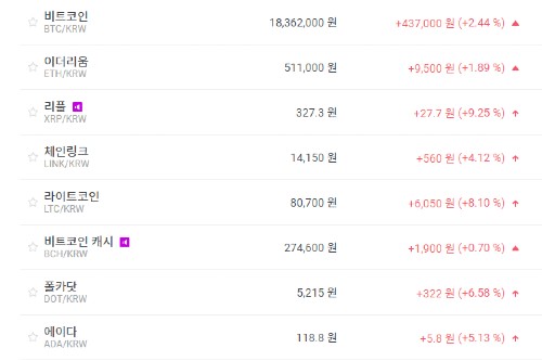 주요 가상화폐의 상승폭을 살펴보면 체인링크 4.12%, 라이트코인 8.10%, 비트코인캐시 0.70%, 폴카닷 6.58%, 에이다 5.13%, 비트코인에스브이 2.49%, 이오스 5.28%, 트론 2.74%, 스텔라루멘 4.71% 등이다.