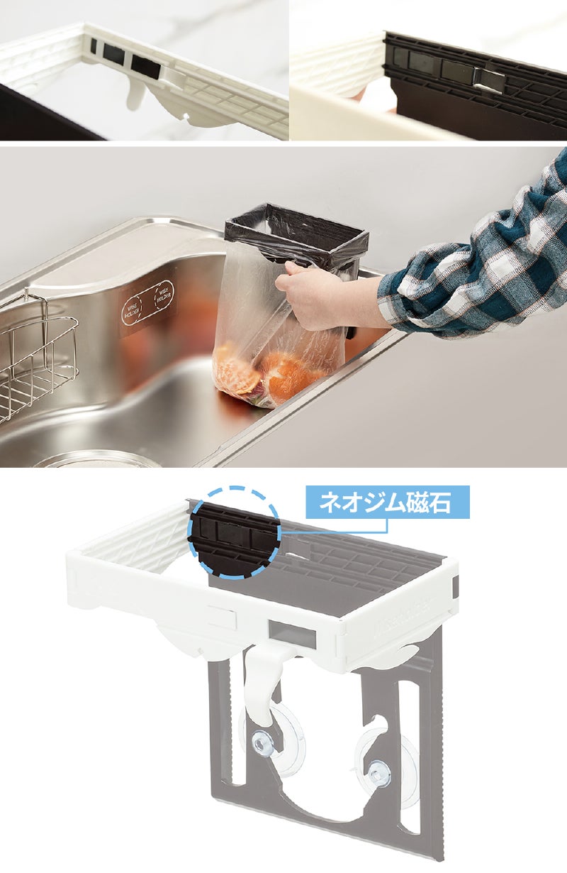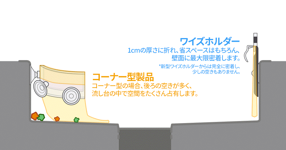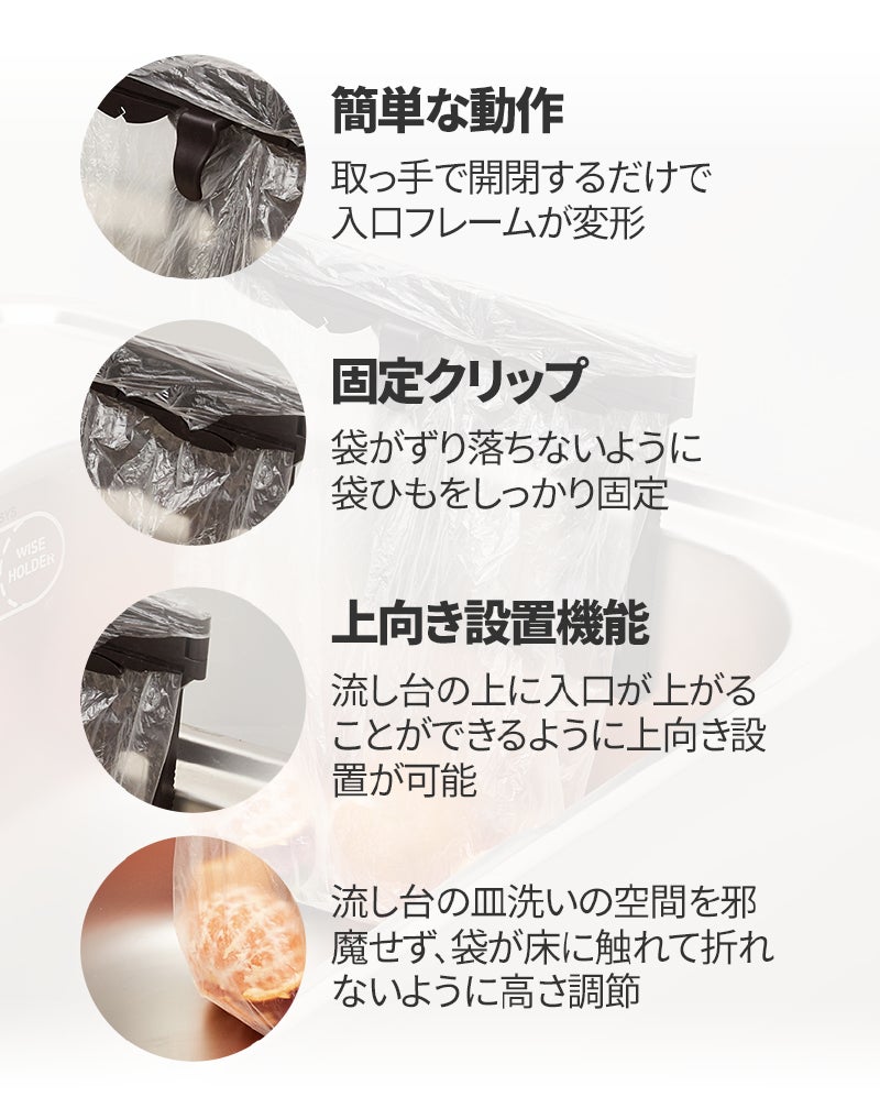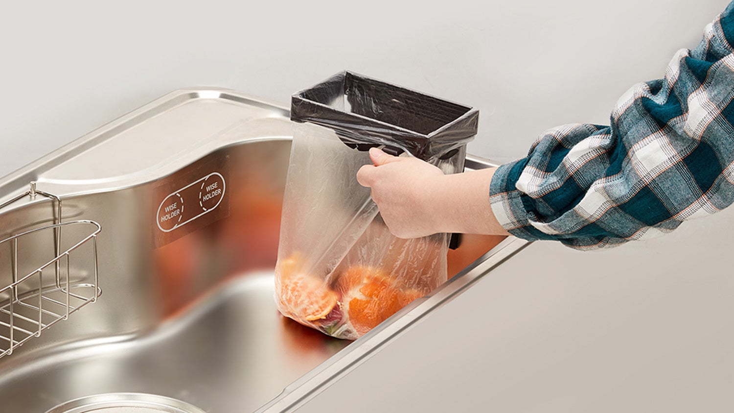 「Wiseholder」(ワイズホルダー)なら、袋一枚でゴミ処理が完了するため、シンクから生ごみを移動させることなく効率的に処理することができます。