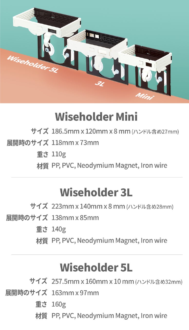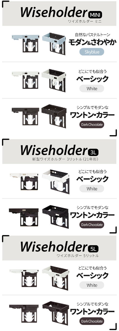 カラーはベーシックなホワイトとシンプルなダークチョコレートをご用意いたしました。さらにワイズホルダーmini(2Lサイズ)のみ、爽やかなスカイブルーを加えた3色からお選びいただけます。